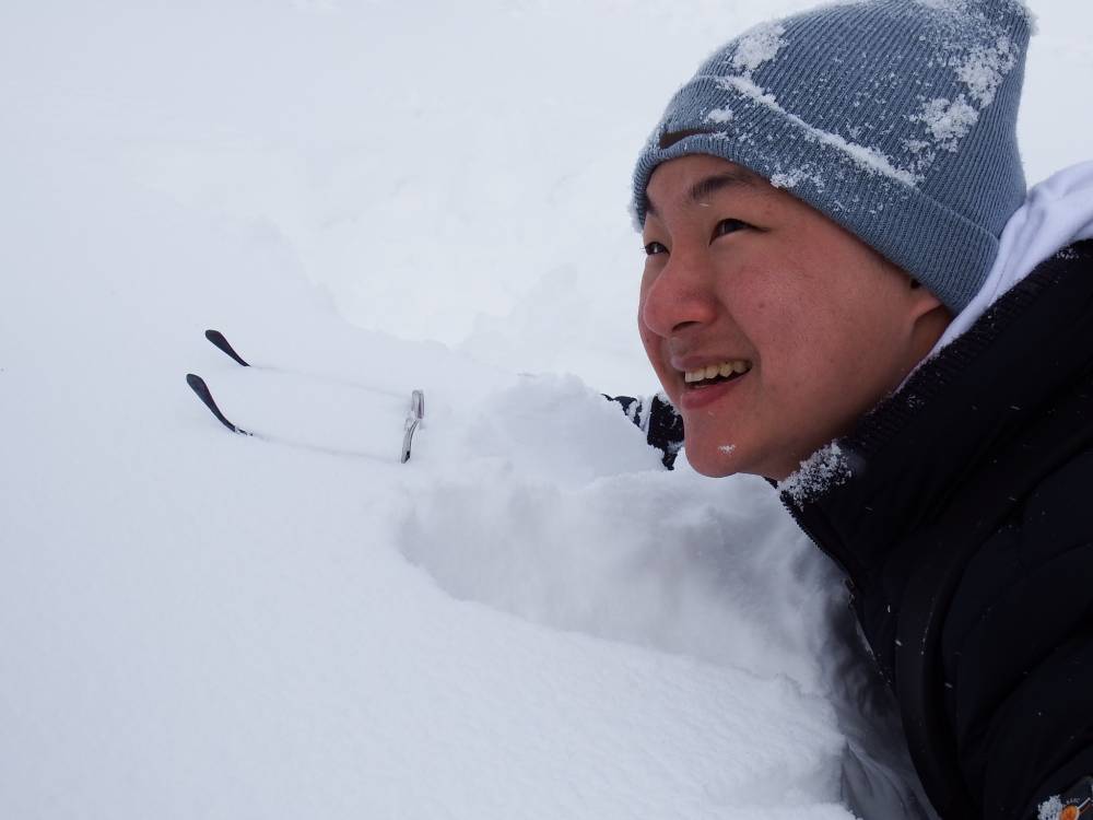 息子さん、疲れ果てたのか、雪とたわむれているのか…この笑顔は、たぶん後者ですね。