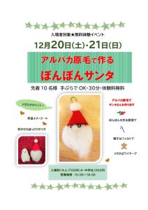牧場でもハッピーサンタをたくさん迎えたいので、ぽんぽんでサンタを作る無料体験会を行います。