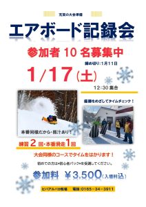 さて、1月17日はエアボード「大会」さながらの記録会を行います。特典もいっぱいですよ。募集人数は10名。今年のコンディションを整えるチャンスですね。ご参加お待ちしています。