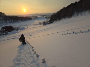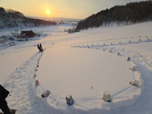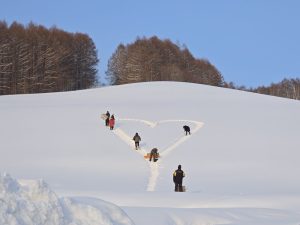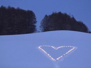 準備は11日から。スタッフ総出のハートふみふみ大作戦がスタート。今年は小さめのハートでね…が合言葉。みんなが行きやすいよう下位置での完成をめざして、斜面の雪を踏みました。